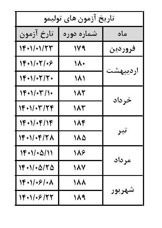از داوطلبین عزیز خواهشمندیم حتما به تاریخ های برگزاری آزمون توجه نمایند و همچنین از تکمیل نشدن تاریخ مورد نظر اطمینان حاصل نمایند.
